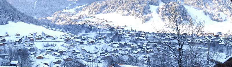 over the resort centre to the ski slopes of Le Pleney which are floodlit in high season.